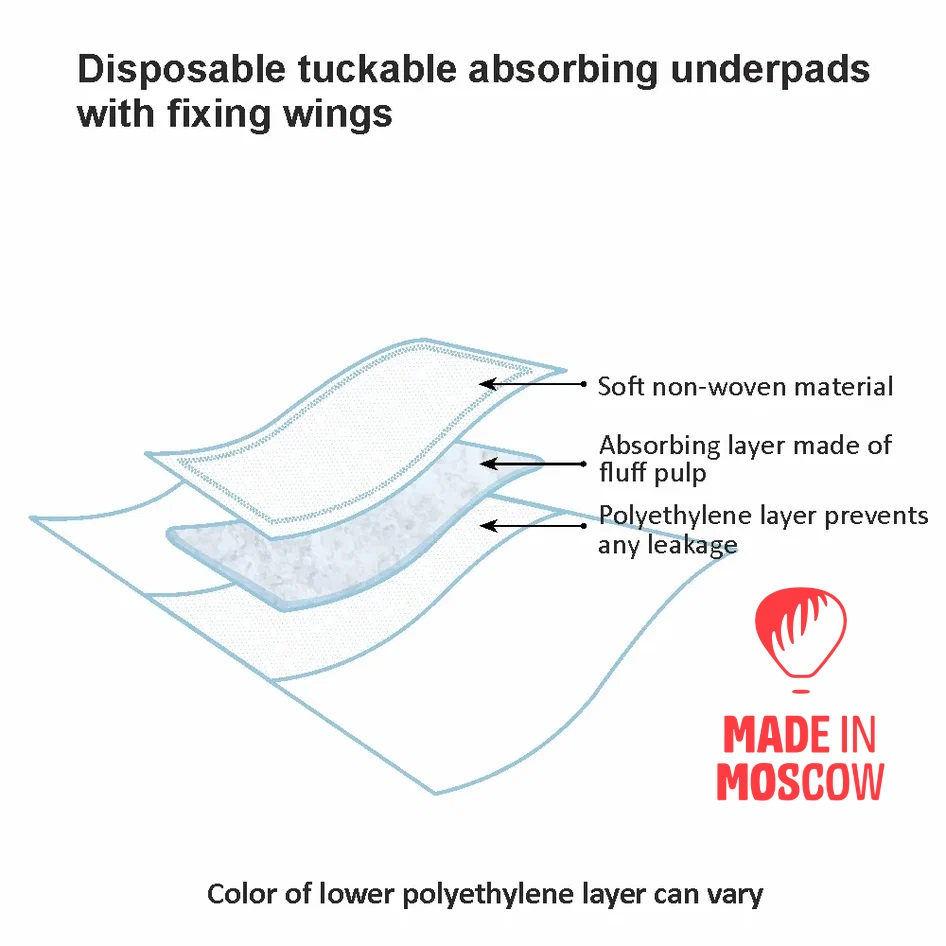 Disposable tuckable absorbent underpads with fixing wings by Peligrin are perfectly helpful while taking care of a baby. They absorb well and prevent any leakage, which means mothers can be sure that sofa, bed and swaddling table will be protected. The underpads Peligrin with fixing wings are created for better protection of baby cribs and strollers. Our advantages: • All the underpads that are manufactured by the group of companies Peligrin have EC declarations of conformity and comply with all the European standards of quality. • The surface of the underpads that is made of high quality non-woven material quickly passes liquid to the inner layers of the product. • The absorbing layer is made of natural fluff pulp, bleached without the use of chlorine. • The polyethylene layer safely locks in liquid and prevent any leakage. • The underpads of this type have big protective surface due to special wings that can be put under the mattress thus providing better fixation. Our underpads can be used: • at home • on a visit • during a trip • at the doctor’s • during massage Components: non-woven material, cellulose fluff pulp, waterproof (polyethylene) film, glue. Size: 90x180, cm Size of absorbing layer: 60x90 cm Pack: 20 pcs