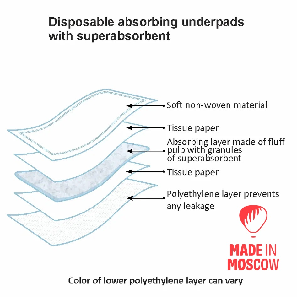 Disposable absorbent underpads with tissue paper and superabsorbent by Belle Epoque are perfectly helpful while taking care of a baby. They absorb well and prevent any leakage, which means mothers can be sure that sofa, bed and swaddling table will be protected. Our advantages: • All the underpads that are manufactured by the group of companies Peligrin have EC declarations of conformity and comply with all the European standards of quality. • Have 5 layers for better absorbing. • The surface of the underpads that is made of high quality non-woven material quickly passes liquid to the inner layers of the product. • The absorbing layer is made of natural fluff pulp, bleached without the use of chlorine. • Due to tissue paper liquid spreads fast and even inside the underpad, so the surface stays dry and soft. • The underpads perfectly absorb liquid due to superabsorbent that turns liquid into gel and absorbs odor. • The polyethylene layer safely locks in liquid and prevent any leakage. Our underpads can be used: • at home • on a visit • during a trip • at the doctor’s • during massage Components: non-woven material, cellulose fluff pulp, superabsorbent, tissue paper, waterproof film (polyethylene), glue. Size: 60x40, 60х60 cm Pack: 15 pcs