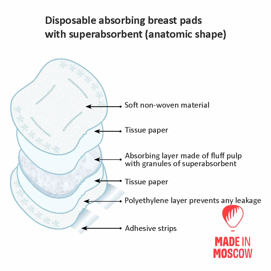 Breast pads by Belle Epoque are ideally suited for mothers during lactating period. They perfectly absorb liquid and protect the skin of the breast. They are soft, suited for sensitive nipple, do not cause irritation, stay soft during the day, and do not get rough even having absorbed breast milk. They follow the shape of the breast and are unnoticeable from the outside, protect underwear. Our advantages: • All the breast pads that are manufactured by the group of companies Peligrin have EC declarations of conformity and comply with all the European standards of quality. • Breast pads of this type have unique anatomic shape that makes it more comfortable. • Soft surface made of non-woven material is ideally suited for sensitive nipples skin. • Absorbing layer made of natural fluff pulp perfectly absorbs breast milk. • Contain superabsorbent that turns liquid into gel and facilitates its fast absorption. • Protective layer made of waterproof film prevents any leakage. • Have two special adhesive strips that prevent the pad from shifting. • Each breast pad is single-packed. • Have stylish design. Components: non-woven material, cellulose fluff pulp, superabsorbent, tissue paper, waterproof film (polyethylene), glue, release paper (anti-adhesive). Diameter: 130 cm Pack: 30, 60 pcs