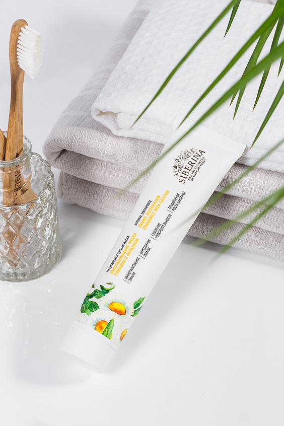 This toothpaste has an all-natural and safe composition, which is confirmed by the COSMOS NATURAL certificate - one of the strictest international standards for natural and organic cosmetics. Increased tooth sensitivity doesn't just cause discomfort when you eat very hot or cold foods. Over time, thinning enamel can lead to the development of more serious conditions. To keep your teeth healthy and beautiful, use Chamomile Calcium Natural Toothpaste, which not only effectively cleans enamel, but also strengthens it to reduce tooth sensitivity. - RDA 70 (toothpaste abrasiveness index) - Mineralizes enamel - Strengthens enamel - Reduces sensitivity - Suppresses bacterial growth Created from high quality natural ingredients. Does not contain fluoride, sls, parabens, triclosan, aggressive abrasives, artificial preservatives, flavors and colors. Natural therapeutic and preventive toothpaste “Enamel Restoration” fills microcracks in the enamel of teeth, remineralizes and strengthens it, accelerates the regeneration of the oral mucosa. Restores the mineral balance of dental tissues and tooth enamel. HYDROXYAPATITE/CALCIUM CARBONATE - the main building substance of enamel, buys tubules in the open dentin layer, remineralizes and strengthens enamel. ROMANOSHKA ETHYRIC OIL protects teeth from caries, has an anti-inflammatory effect, reduces bleeding gums. ALOE VERA EXTRACT fights inflammatory processes, relieves pain, discomfort, prevents bleeding gums, has regenerating and wound-healing properties. Birch Bark EXTRACT has an anti-inflammatory effect, helps to strengthen the blood vessels of the gums. Lime extract has a bactericidal and wound healing effect. CAUTION: Do not use in case of individual intolerance to the components. Keep away from children! Do not swallow! STORAGE CONDITIONS: Store at temperatures from +5°C and not higher than +25°C. VOLUME: 75 ml SHELF LIFE: 2 years, after opening keep for 6 months.