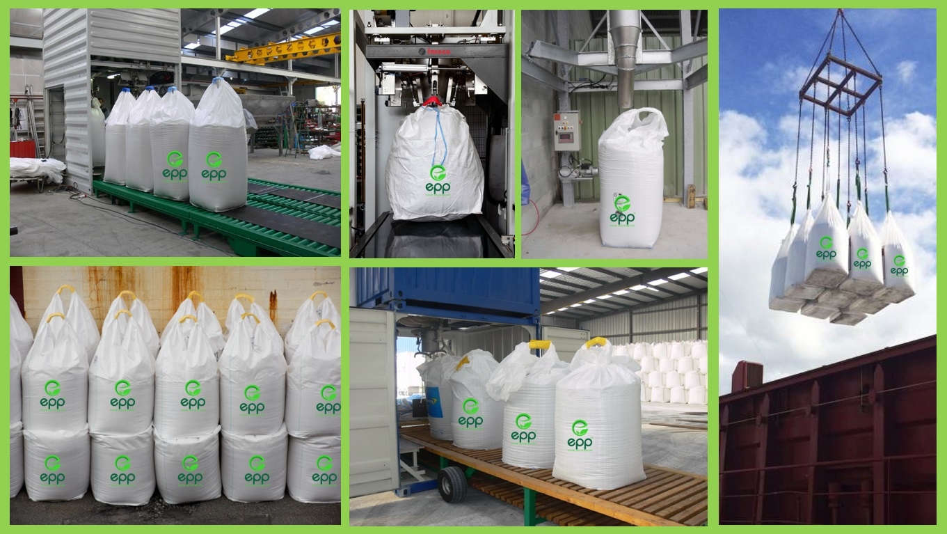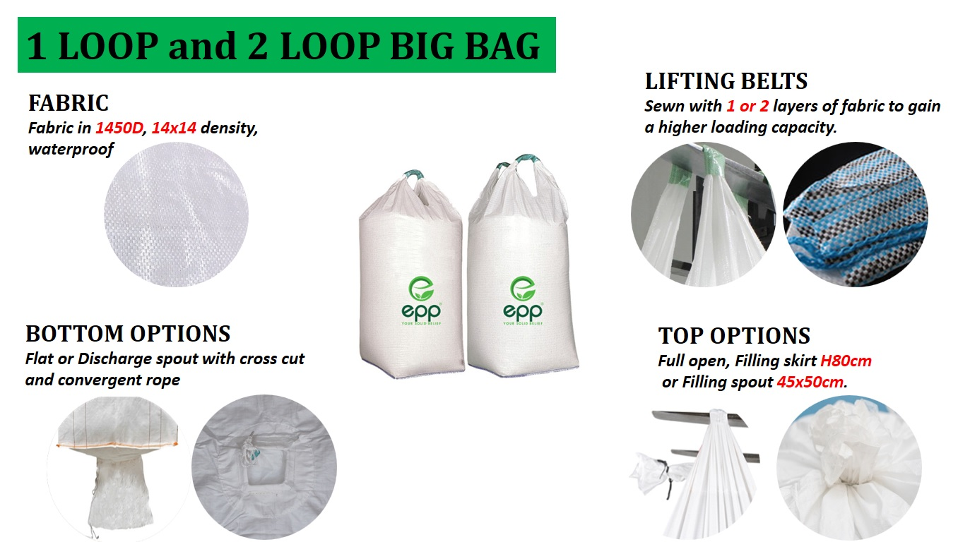 Website:www.epp.vn Email:sales@epp.vn Tel: +84 986 002 888 Youtube: EPP VIETNAM PRODUCT DESCRIPTION MATERIAL: 100% virgin PP BODY SIZE: 90X90X120cm/ Customer's request BODY FABRIC: 170-200g/m2 LOOP BELT: 4 LOOPS (Cross corner/ side-seam loops), WIDTH: 70mm, HEIGHT: 300mm DENIER: 1450D WEAVING DENSITY: 14X14/15X15/16X16 APPLICATION: ceramic sand, lime, cement, sand, sawdust, construction waste,urea, fertilizers, grains, rice, wheat, corn, seeds, potatoes, coffee beans, soybeans,ore powder, iron ore, granules, aluminum ore, fertilizers, chemicals, plastic resins, minerals,.. SAFETY FACTOR: 5:1/6:1 BRAND NAME: EPP VIETNAM FEATURE: Breathable and airy, anti -static, conductive, UV stabilization, reinforcement, dust-proof, moisture-proof PACKAGE: Pallet size : 100x100x1200 cm / Packaging type : 100 pcs per pallet or 200 pcs per bale. SWL: 1000-2000KG BAG TOTAL WEIGHT: 1.8KG DOCUMENT POCKET: PP/PE A4 size LAMINATION: coated/ uncoated inside SEWING: single needle sewing COLOR: white, blue, green, orange, black, beige/ customer's request PAYMENT TERM: T/T or L/C Sling jumbo bags, PP bulk sling bags, FIBC sling bags, industrial sling bags, sling bags for cement, Pre-sling Bag, Cement Pre-Sling Bag, Jumbo sling bag, Cement Jumbo Bags, soft pallet, cement bag lifting , Lifting bags, soft lifting bags, Sling Big Bag For Cement FIBC bags, big bag, bulk bag, bulka bag, 1 tone bag, FIBC Vietnam, sling cement bag, super sacks, PP woven sacks, PP woven bag, polypropylene bags, transport packaging, plastic packaging, vented log bag, 1 tone tote bags, foodgrade bag U panel big bag, 2 ton bags, jumbo big bag 1 ton, UN big bag, vietnam fibc supplier