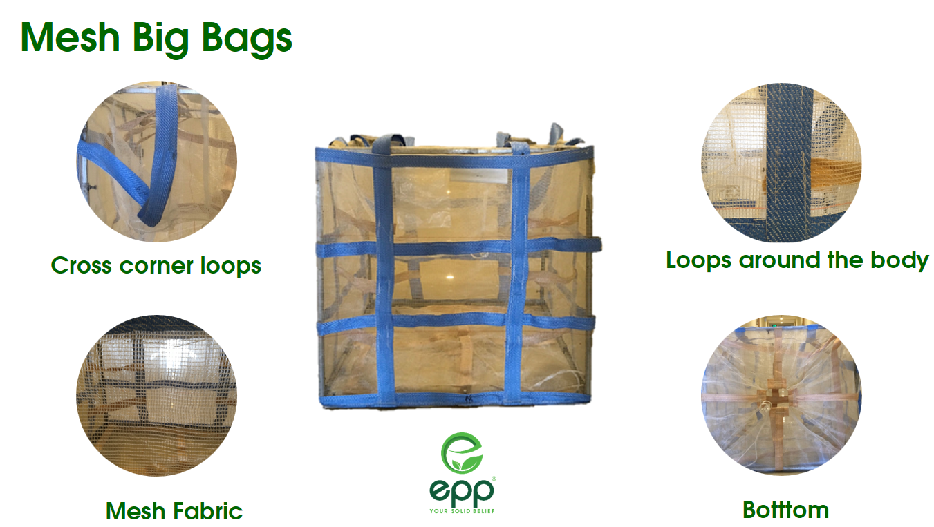 Website:www.epp.vn Email:sales@epp.vn Tel: +84 986 002 888 Youtube: EPP VIETNAM PRODUCT DESCRIPTION MATERIAL: 100% virgin PP BODY SIZE: 90X90X120cm/ Customer's request BODY FABRIC: 170-200g/m2 LOOP BELT: 4 LOOPS (Cross corner/ side-seam loops), WIDTH: 70mm, HEIGHT: 300mm DENIER: 1450D WEAVING DENSITY: 14X14/15X15/16X16 APPLICATION: ceramic sand, lime, cement, sand, sawdust, construction waste,urea, fertilizers, grains, rice, wheat, corn, seeds, potatoes, coffee beans, soybeans,ore powder, iron ore, granules, aluminum ore, fertilizers, chemicals, plastic resins, minerals,.. SAFETY FACTOR: 5:1/6:1 BRAND NAME: EPP VIETNAM FEATURE: Breathable and airy, anti -static, conductive, UV stabilization, reinforcement, dust-proof, moisture-proof PACKAGE: Pallet size : 100x100x1200 cm / Packaging type : 100 pcs per pallet or 200 pcs per bale. SWL: 1000-2000KG BAG TOTAL WEIGHT: 1.8KG DOCUMENT POCKET: PP/PE A4 size LAMINATION: coated/ uncoated inside SEWING: single needle sewing COLOR: white, blue, green, orange, black, beige/ customer's request PAYMENT TERM: T/T or L/C Industrial Mesh Jumbo Bag, PP mesh bag, breathable jumbo bag, mesh firewood bags, Firewood Net Bag, Mesh Produce Bags, industrial plastic mesh bags ventilated duffel bag, FIBC Ventillated Bags, Vented Jumbo Sacks, Big Vented Log Bag, perforated bulk bags, perforated log bags, Log Sacks, ventilate firewood packing bag, Breathable Ventilated Big Bags, Ventilated Bulk Bags, big bag for wood, big bag for timber, LOG BAGS Firewood ,Log Sacks ,vented bulk sacks ,vented bulk bags, net tote bags, net FIBC bulk vented sacks, firewood sacks, Bulk Vented Log Bags