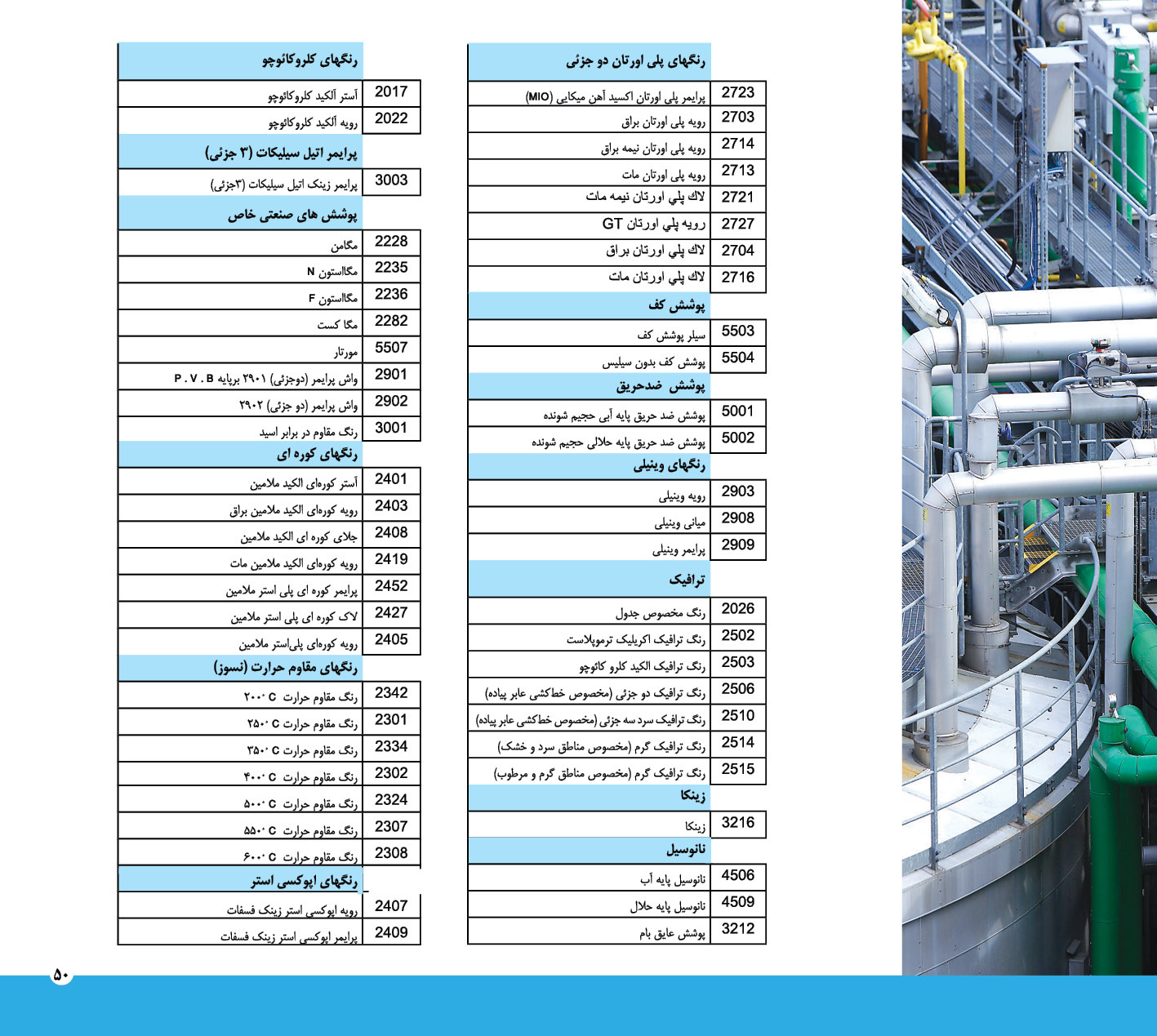 رنگ های روغنی ، پایه آب ، پلاستیک ، نیمه پلاستیک ، اکریلیک ، پرایمر ها ، ضد زنگ ها ، نانوسیل ، رنگ های اکریلیک تکسچر ، رنگ استخری ، عایق بام ، لاک اکریلیک ، اکریلیک لاتکس ، اکریلیک سیلیکون ، انواع تینر ها ،