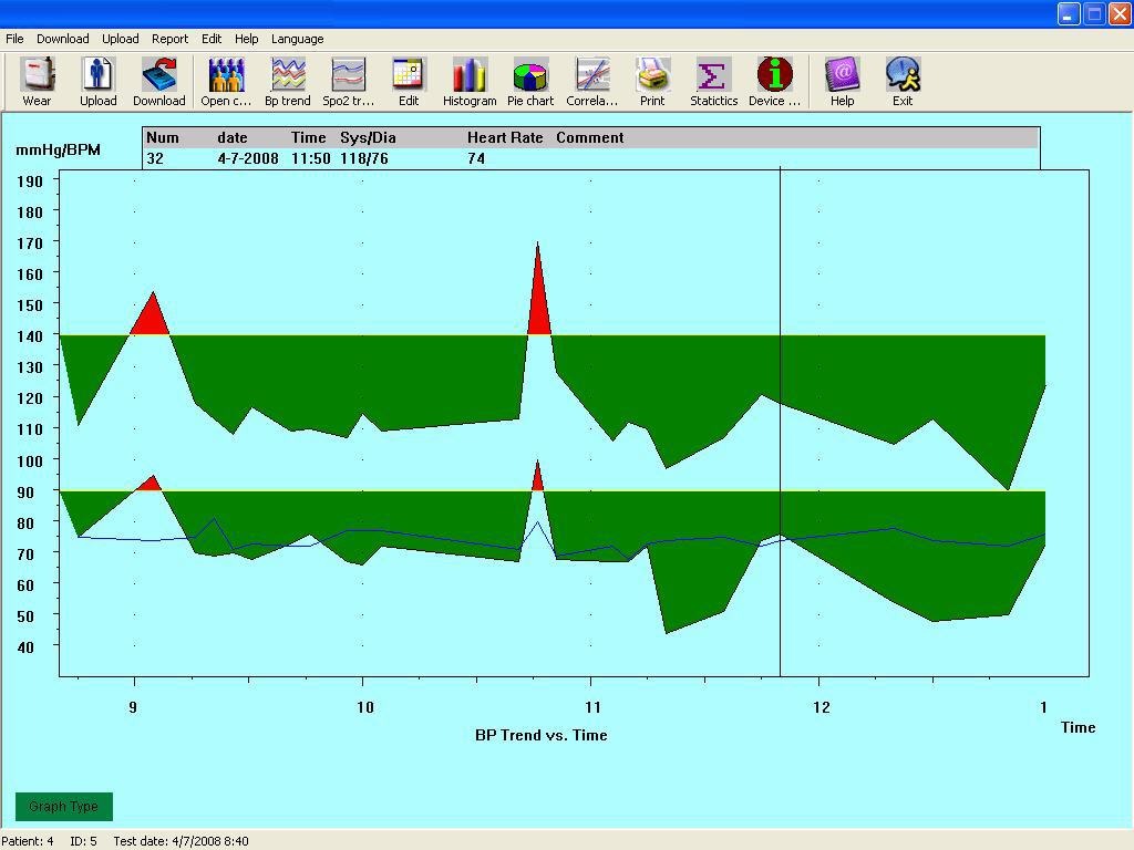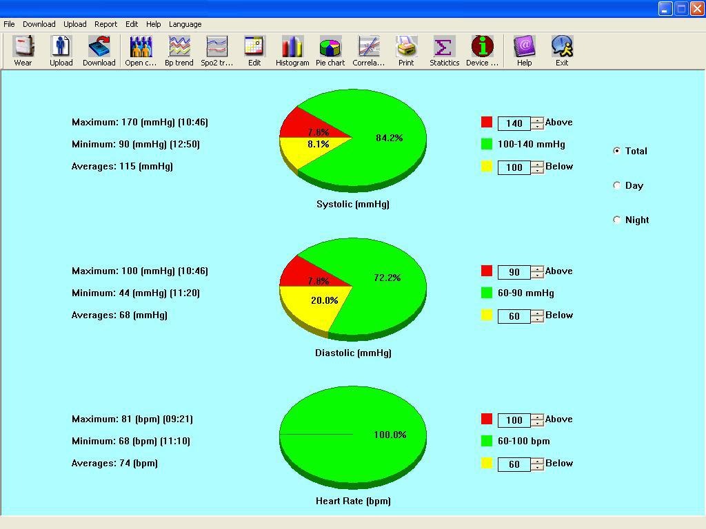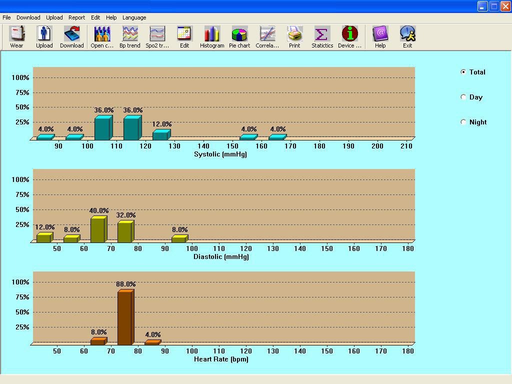 قابلیت نمایش و پرینت فشار سیستولیک ، دیاستولیک و Heart Rate ، بر اساسBP Trend , Pie chart , Histogram , Correlation line وFrequency Histograms