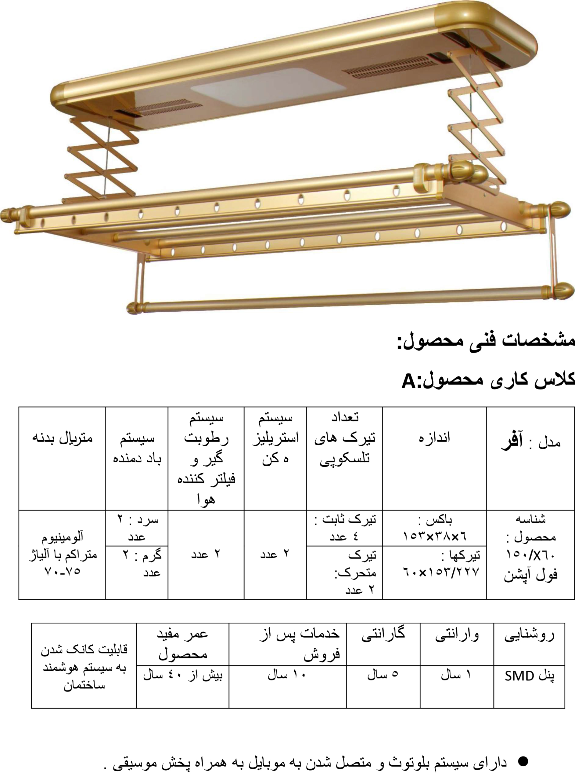 3- دارای 2 تیرک ثابت تلسکوپی وبهره‌ور بودن جهت آویز 8۰ الی 1۰۰ تکه لباس درمساحت کمتر از 2 مترمربع