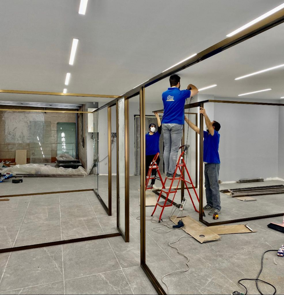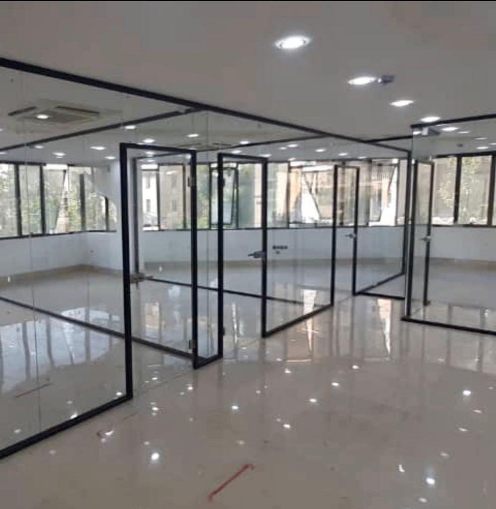 پارتیشن تمام شیشه ای فریملس با پروفیل آلومینیومی اختصاصی در رنگ های مختلف و شیشه های سکوریت 10 میل نشکن و یراق آلات ایتالیایی و چینی برای درب