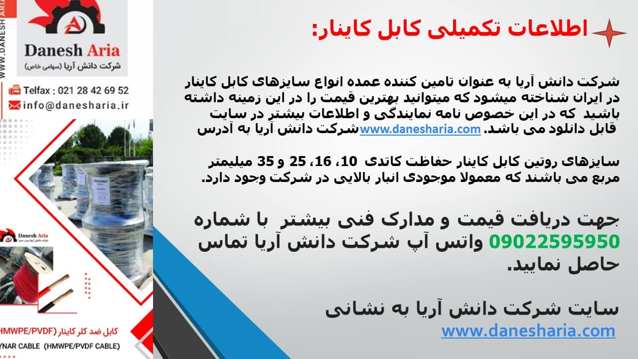 شرکت دانش آریا به عنوان تامین کننده عمده انواع سایزهای کابل کاینار در ایران شناخته میشود که میتوانید بهترین قیمت را در این زمینه داشته باشید  که در این خصوص نامه نمایندگی و اطلاعات بیشتر در سایت شرکت دانش آریا به آدرس www.danesharia.com  قابل دانلود می باشد.
