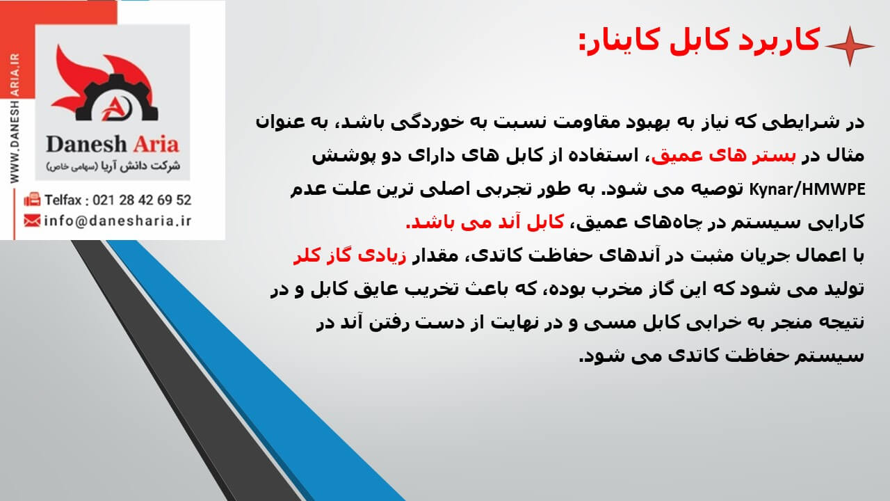 شرکت دانش آریا به عنوان تولیدکننده و تامین کننده انواع مختلف آندهای حفاظت کاتدی در ایران، به منظور تکمیل بیشتر محصولات حفاظت کاتدیک و تأمین نیازهای صنعت حفاظت از خوردگی کشور و به علت کمبود کابل کاینار با کیفیت و قابل اعتماد نوع HMWPE/PVDF در کشور، نسبت به تأمین کابل کاینار با کیفیت و مناسب اقدام کرده است.