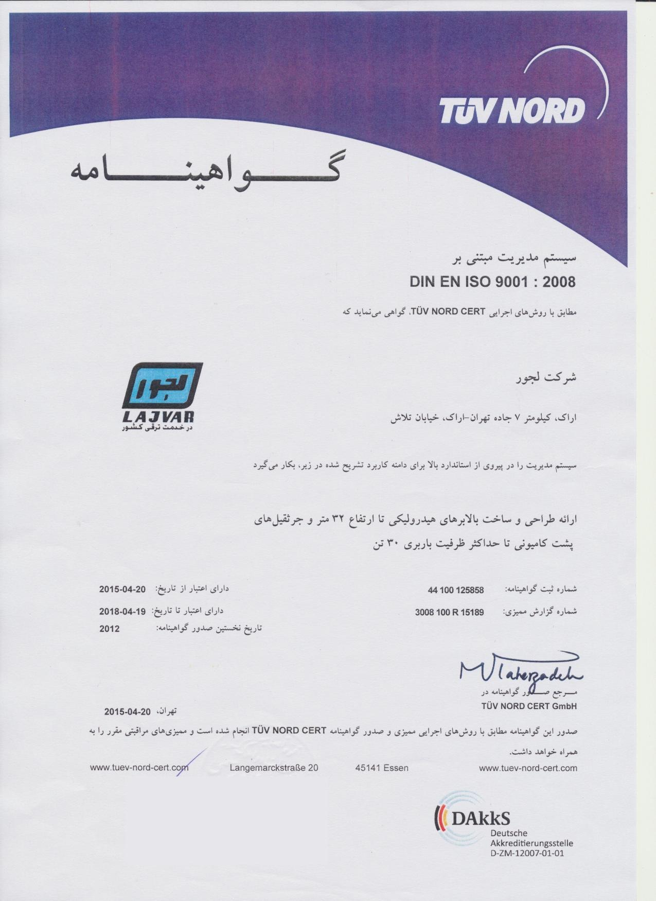 لجور به عنوان بخشی از گروه صنعتی لجور هم اکنون تنها دارنده گواهی نامه بین المللی ISO9001:2008 و تنها دارنده پلاک گواهی بازرسی کیفیت و استاندارد ایران و دارای مجوز شماره گذاری خودرو از سوی معاونت راهنمایی و رانندگی کل کشور در زمینه طراحی، ساخت و تولید بالابرهای هیدرولیکی و جرثقیل های پشت کامیونی در داخل کشور به شمار می رود. توجه به سفارش مشتریان گرامی، کنترل همه جانبه کیفیت محصولات، بهره گیری از پیشرفته ترین ابزارهای مهندسی در طراحی و ساخت، استفاده از بهترین و مرغوبترین مواد و لوازم در تولیدات، رعایت کامل استانداردها و نکات ایمنی، آموزش کاربران دستگاه ها، ارائه خدمات سریع و به موقع به مشتریان ارجمند از طرف نمایندگی های مجاز خدمات پس از فروش شرکت در نقاط مختلف کشور، همه و همه زمینه حضور گسترده محصولات لجور را در پروژه های نفتی، ساختمانی، تاسیساتی، کشاورزی، امداد رسانی و ... فراهم نموده است. در ادامه یادآور می شود که مسئولیت طراحی، مشاوره و نظارت بر ساخت دستگاه های سفارشی تماماً به عهده واحد طراحی و مهندسی شرکت لجوراست. این واحد تمامی مراحل طراحی دستگاه های بالابر و جرثقیل را مطابق با آخرین موازین استانداردهای بین المللی، اروپایی و امریکایی از قبیل ISO، DIN، BS و ANSI به انجام می رساند در این راستا از روش های علمی پذیرفته شده در علوم طراحی نظیر روش اجزای محدود (Finite Element Method) استفاده می گردد و درکلیه مراحل طراحی از نرم افزارهای مختلفی از قبیل Ansys جهت آنالیز و محاسبه استحکام قطعات دستگاه ها و Auto Cad & Mecanical desktop برای ترسیم نقشه ها و طراحی اجزا و Workingmodel جهت شبیه سازی دینامیکی مکانیزم ها استفاده می شود. همه محصولات این شرکت بر اساس استاندارد کارخانه ای تدوین شده توسط شرکت بازرسی کیفیت و استاندارد ایران تحت پوشش وزارت صنایع و معادن و در حضور بازرسان آن شرکت که از مرکز به کارخانه می آیند تست شده و در نهایت در صورت احراز شرایط مطلوب به کسب گواهی کیفیت و پلاک استاندارد ایران نائل می گردد. شایان ذکر است که لجور در طراحی و ساخت بالابرهای خود از تمامی استانداردهای جهانی پیروی می کند.
